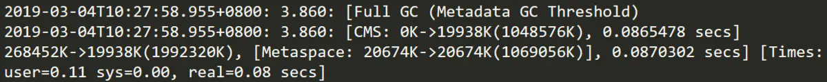 通过[Full GC (Metadata GC Threshold)我们知道这是一次针对整个堆(包括年轻代和老年代)的Full GC,括号中的Metadata GC Threshold说明了gc发生的原因,是因为元空间内存不足够而产生扩容导致的GC,同样的我们还可以通过后面的[CMS: 0K->19938K(1048576K)看出在老年代内存使用为0的时候就发生了Full GC,所以可以确定不是因为老年代内存不够用而发生的gc。
