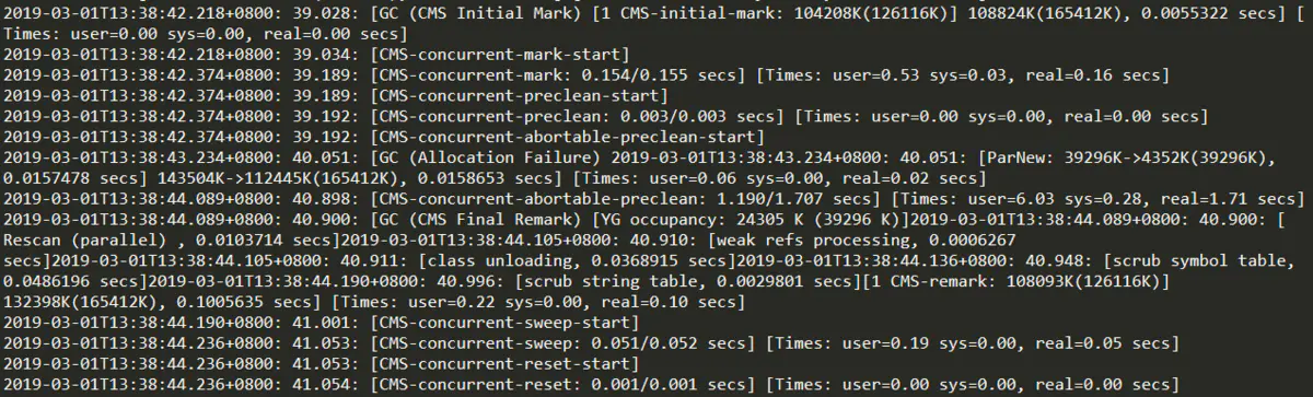 老年代由CMS收集器执行的Major GC相对比较复杂,包括初始标记、并发标记、重新标记和并发清除4个阶段,下面的gc日志也详细地描述了各个阶段的信息。