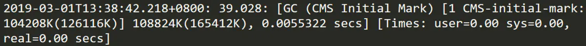 后面的108824K(165412K), 0.0055322 secs表示当前整个堆的内存使用情况和本次初始标记耗费的时间,最后的[Times: user=0.00 sys=0.00, real=0.00 secs]上文已经讲过,下文将不再重复。