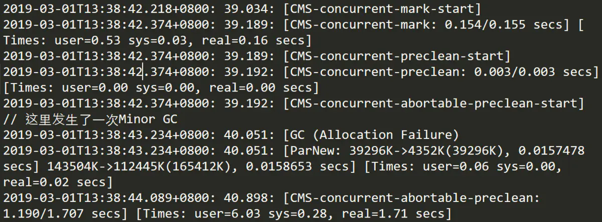 该阶段进行了细分,但都是和用户线程并发进行的[CMS-concurrent-mark表示并发标记阶段,会遍历整个年老代并且标记活着的对象,后面的0.154/0.155 secs表示该阶段持续的时间和时钟时间,耗时0.15秒,可见耗时是比较长的。