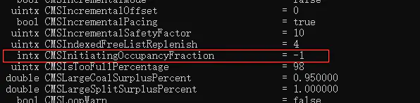 这里再讲一个小知识点,我们上面提到CMS收集器会在老年代内存使用到一定程度时就触发垃圾回收,这是因为CMS收集器的一个缺陷导致的这种设定,也就是无法处理“浮动垃圾”,“浮动垃圾”就是指标记清除阶段用户线程运行产生的垃圾,而这部分对象由于没有做标记处理所以在本次CMS收集中是无法处理的。如果CMS是在老年代空间快用完时才启动垃圾回收,那很可能会导致在并发阶段由于用户线程持续产生垃圾而导致老年代内存不够用而导致“Concurrent Mode Failure”失败,那这时候虚拟机就会启用后备预案,临时启用Serial Old收集器来重新进行老年代的垃圾收集,Serial Old是基于“标记-整理”算法的单线程收集器,这样停顿时间就会很长。这个CMS启动的内存使用阈值可以通过参数-XX:CMSInitiatiingOccupancyFranction来设置,默认为68%(这是网上查到的数据),不过这68%应该是JDK1.8之前版本的默认参数,因为上文中初始标记阶段的gc日志分析中显示老年代内存使用到了83%才开始的CMS垃圾收集。我通过在命令行输入java -XX:+PrintFlagsInitial命令查看到的本机参数如下,也不知道这-1是什么意思,随机?如果你知道,可以在文章下留言告知,十分感谢!