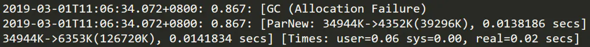 再后面的[ParNew:表示本次gc使用的垃圾收集器为ParNew,我们知道ParNew是针对新生代的垃圾收集器,从这可以看出本次gc是Minor GC。后面紧跟着的34944K->4352K(39296K)的含义是GC前该内存区域已使用容量 -> GC后该内存区域已使用容量(该内存区域总容量),再后面的0.0138186 secs表示该内存区域GC所占用的时间,单位为秒。