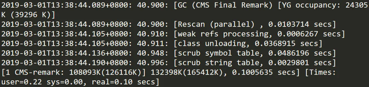 [1 CMS-remark: 108093K(126116K)]表示经历了上面的阶段后老年代的内存使用情况。再后面的132398K(165412K), 0.1005635 secs表示final remark后整个堆的内存使用情况和整个final remark的耗时。
