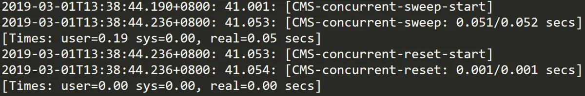 最后的[Times: user=0.06 sys=0.00, real=0.02 secs]表示GC事件在不同维度的耗时,单位为秒。这里面的user、sys和real与Linux的time命令所输出的时间含义一致,分别表示用户态消耗的CPU时间、内核态消耗的CPU时间和操作从开始到结束所经过的等待耗时,例如等待磁盘I/O、等待线程阻塞,而CPU时间不包括这些耗时,但当系统有多CPU或者多核的话,多线程操作会叠加这些CPU时间,所以有时候user或sys时间超过real时间也是完全正确的。