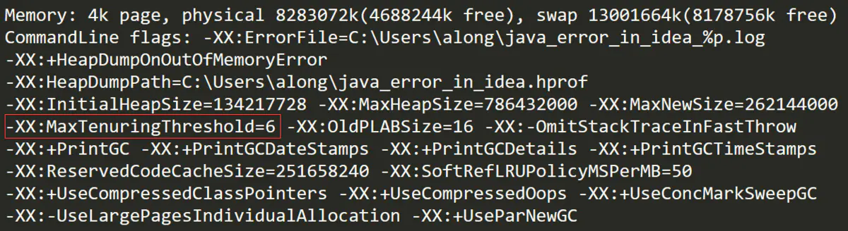 这部分显示了这次JVM的启动参数配置,我们在idea64.exe.vmoptions配置的信息也会在这里打印出来,我们可以从这里看出很多默认配置,比如-XX:MaxTenuringThreshold=6这个参数,表示Survivor区的对象晋升老年代的年龄阈值为6,这个值在JDK 1.8之前默认为15。