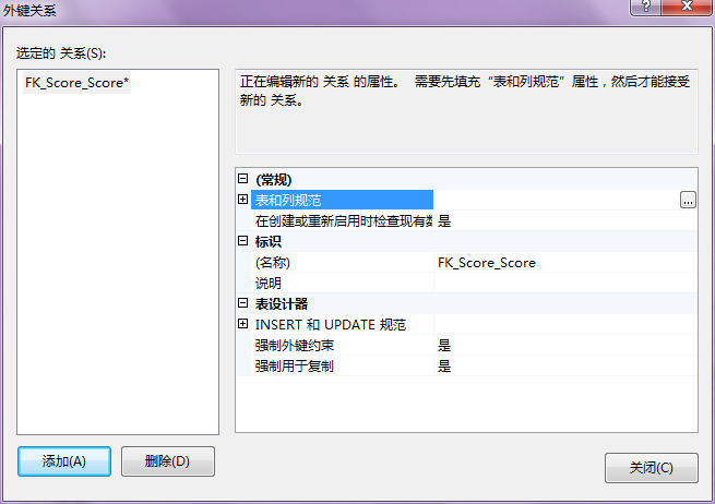 (1)在设计表的时候,在Score表中右键菜单中选择“关系”选项,将显示“外键关系”对话框,单击“添加”按钮可以添加新的关系。