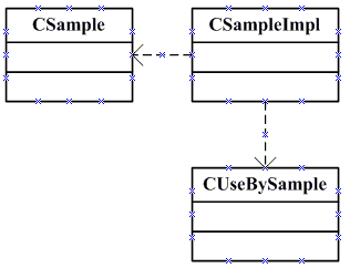 图二演示了重构后的图,在这里,CSampleImpl 与 CSample 之间指针是从 CSampleImpl 指向 CSample。理由是,CSample 当作了接口,CSampleImpl 为 CSample 的实现类,故我认为应该这样画。