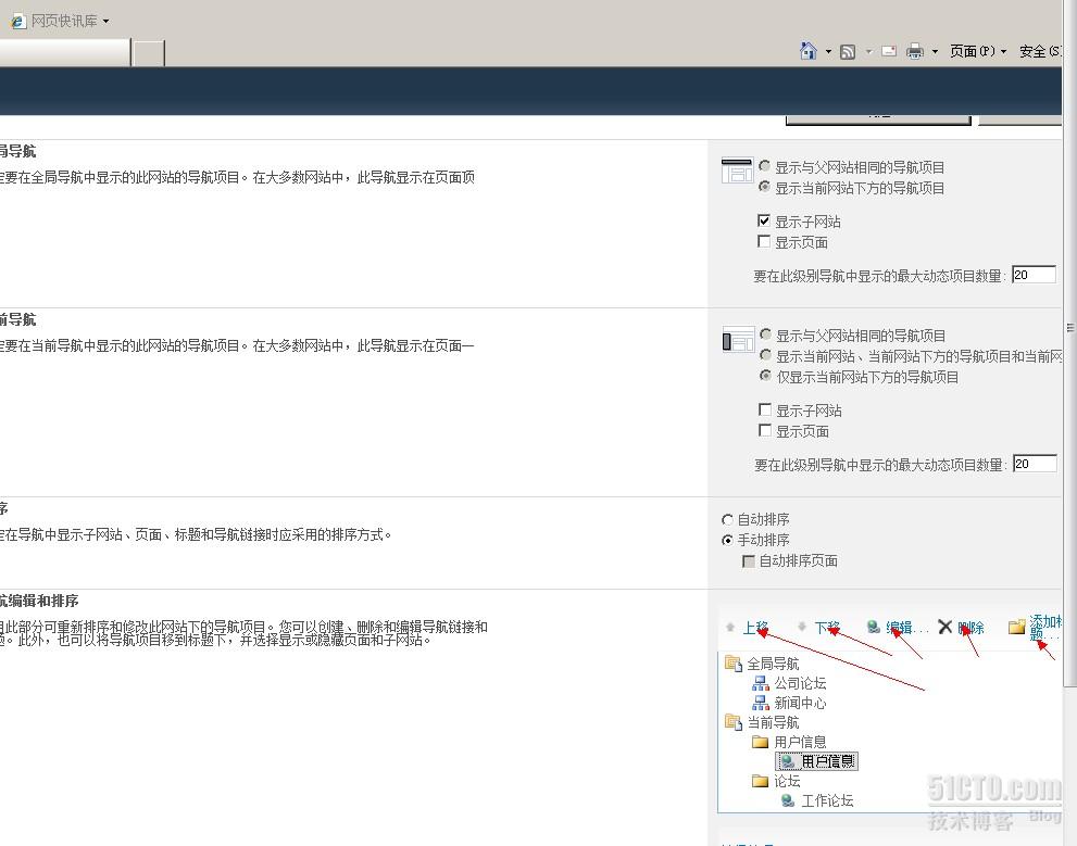全局导航即最上边的导航信息,当前导航则是指左边导航,若想显示子网站则要在全局导航勾选显示子网站复选框,在子网站导航也可以做导航编辑,可以继承父网站也可由自己独特设置。