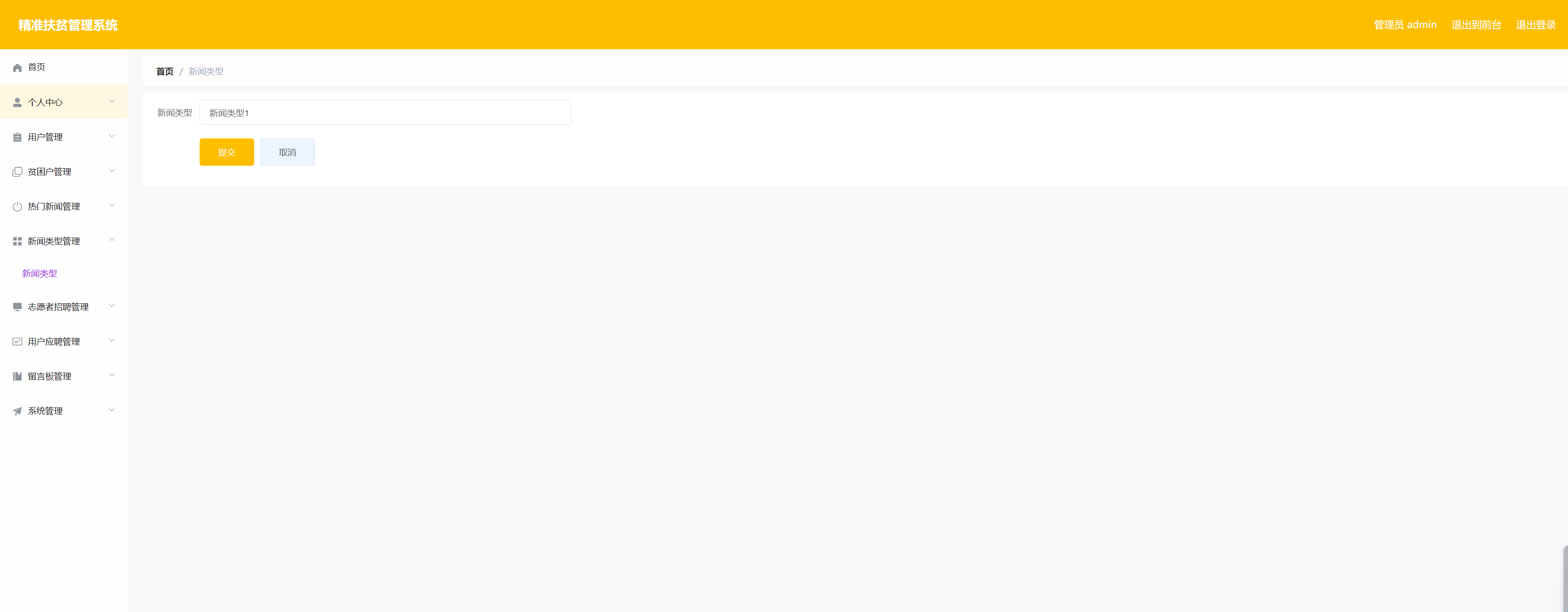 系统管理员可以对新闻类型进行添加,修改,删除以及查询操作。界面如下图所示: