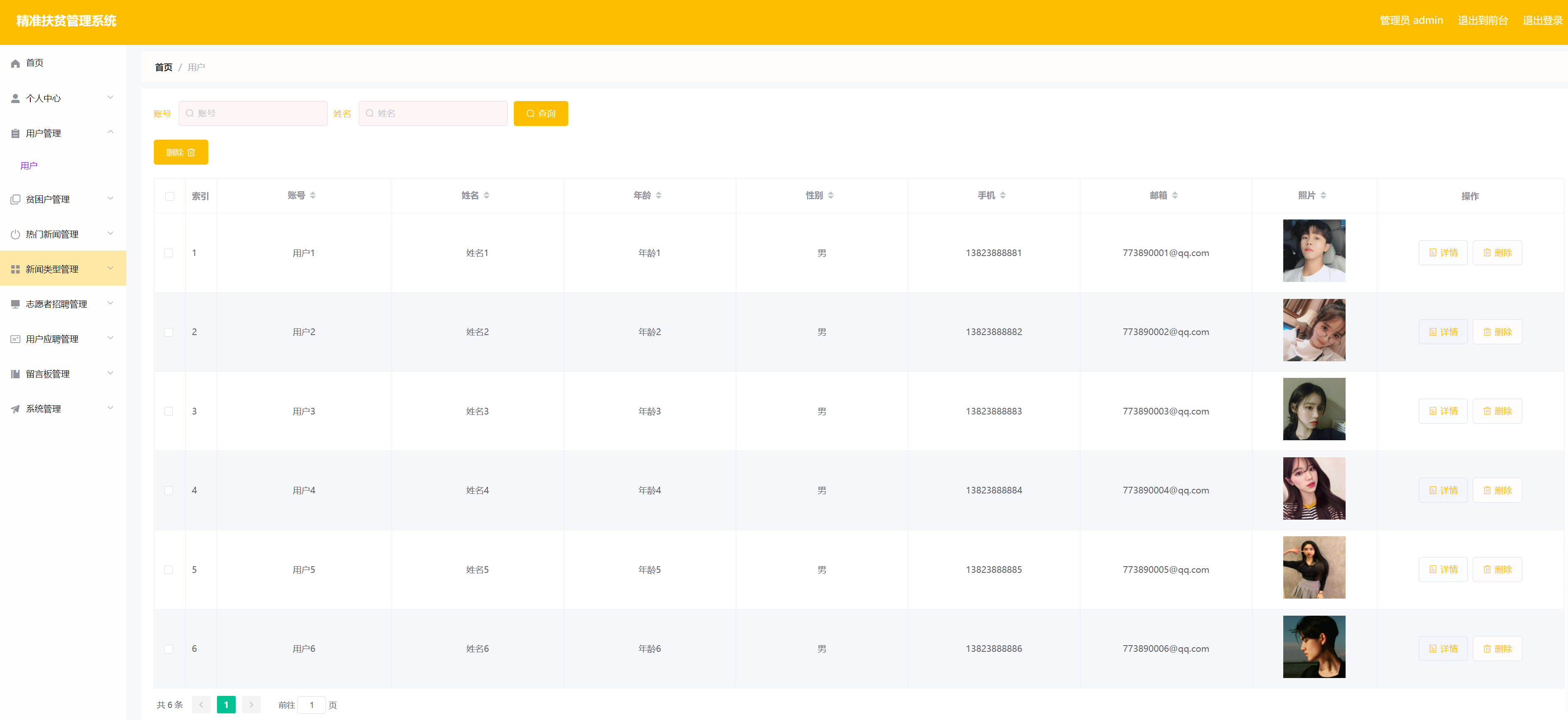 精准扶贫管理系统的系统管理员可以管理用户,可以对用户信息修改删除以及查询操作。具体界面的展示如图5.1所示。