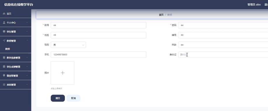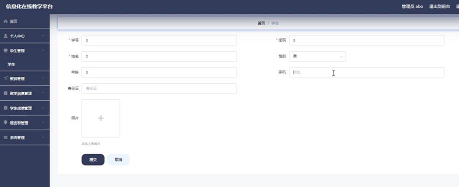 信息化在线教学平台的系统管理员可以管理学生信息检,可以对学生信息信息添加修改删除以及查询操作。具体界面的展示如图5.1所示。