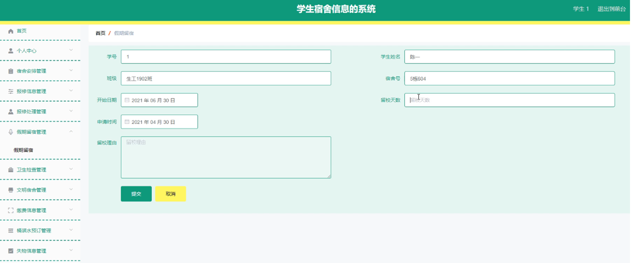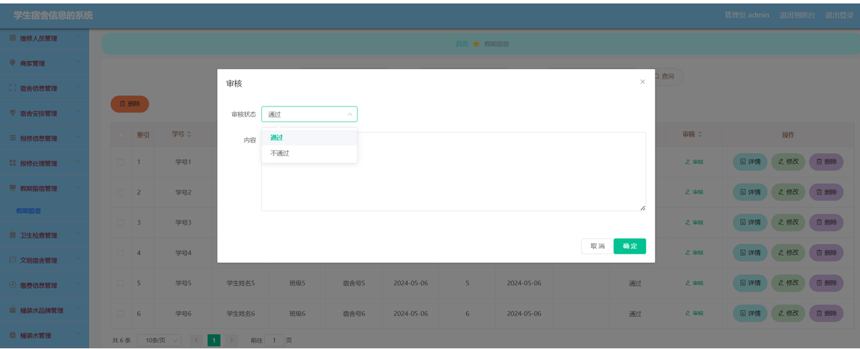 管理员可以对学生提交的假期留宿进行审核操作。界面如下图所示: