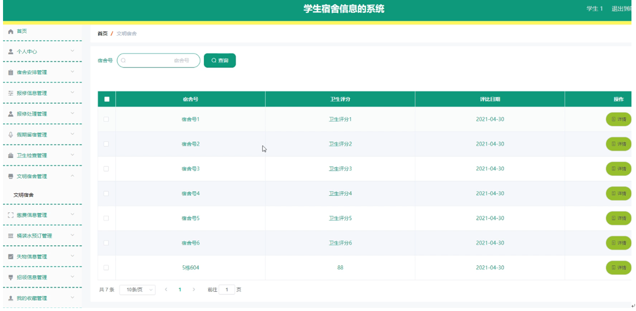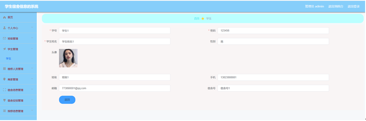 学生宿舍信息管理系统的系统管理员可以管理学生,可以对学生信息添加修改删除以及查询操作。具体界面的展示如图5.1所示。