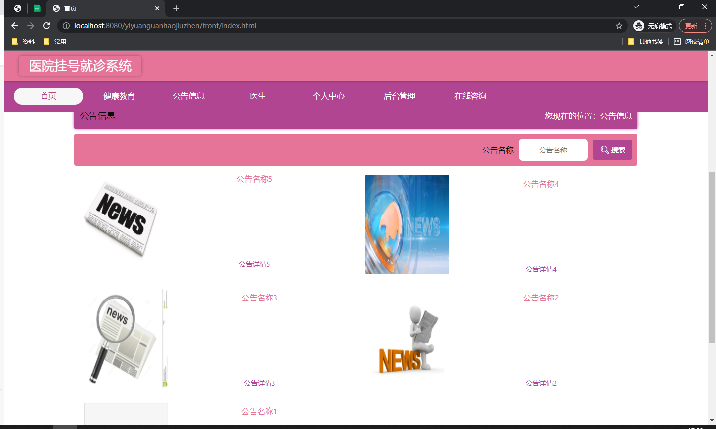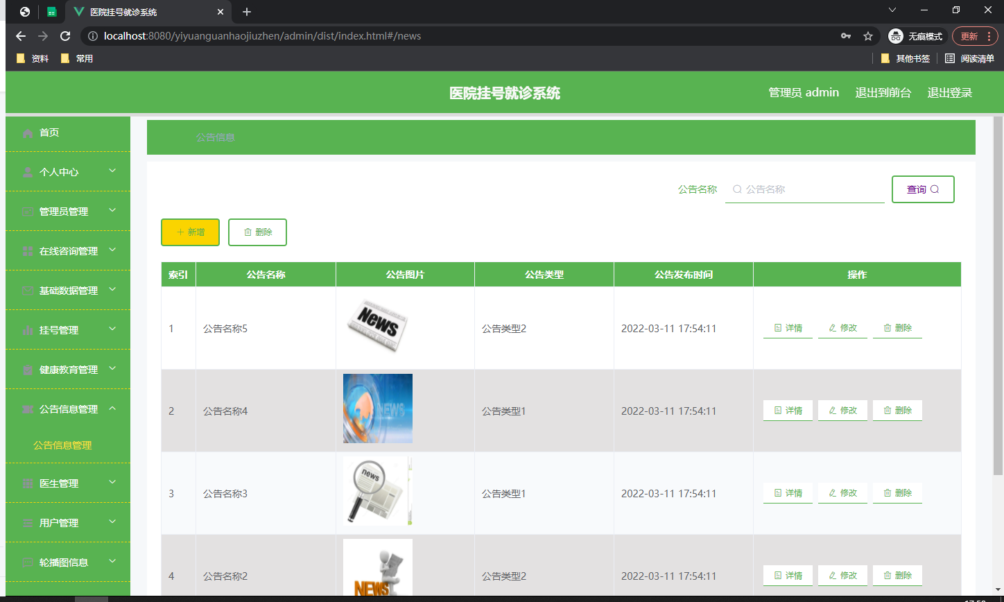 如图5.4显示的就是公告信息管理页面,此页面提供给管理员的功能有:根据公告信息进行新增、修改、查询操作等等。