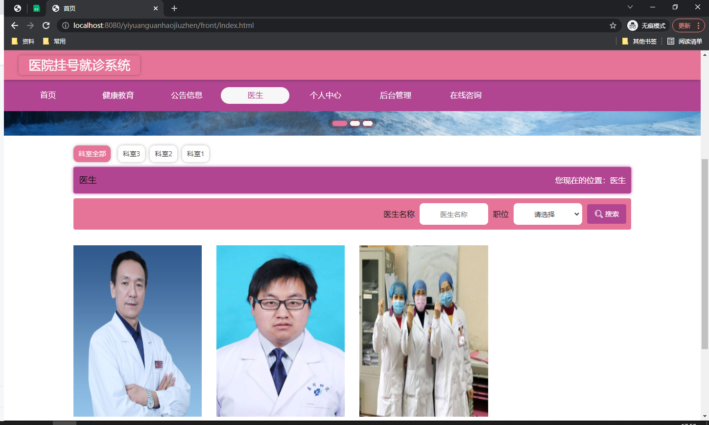 如图5.2显示的就是医生信息管理页面,此页面提供给管理员的功能有:查看已发布的医生信息数据,修改医生信息,医生信息作废,即可删除,还进行了对医生信息名称的模糊查询 医生信息信息的类型查询等等一些条件。