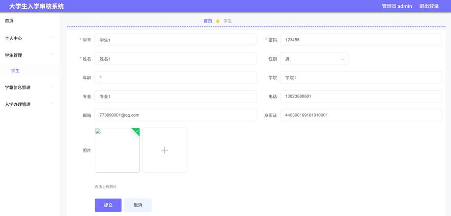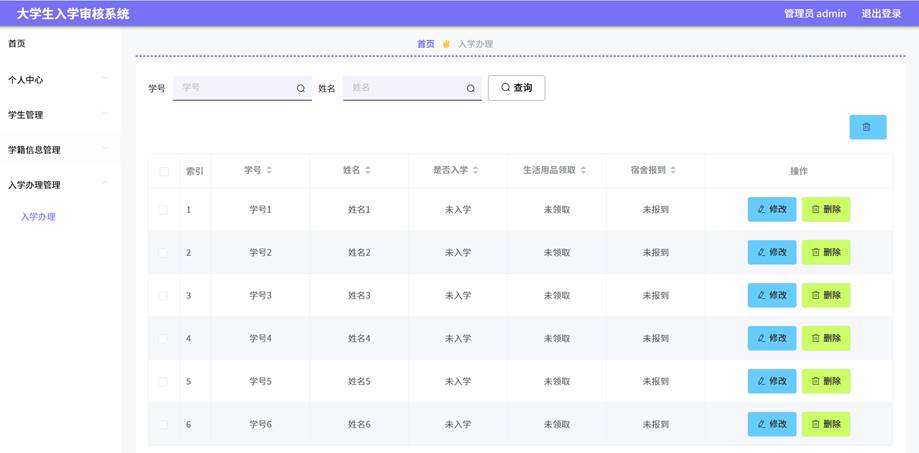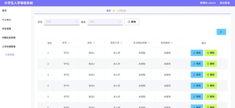 管理员可以对学生入学进行办理,可以添加,修改,删除操作。界面如下图所示: