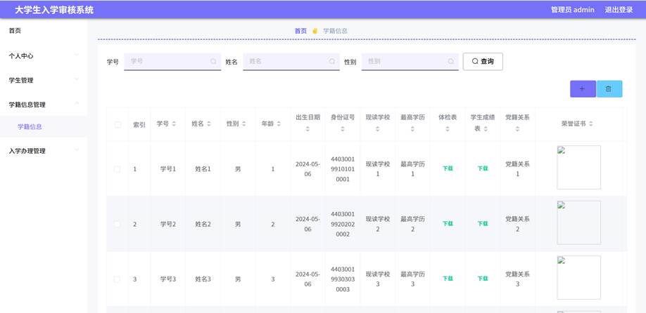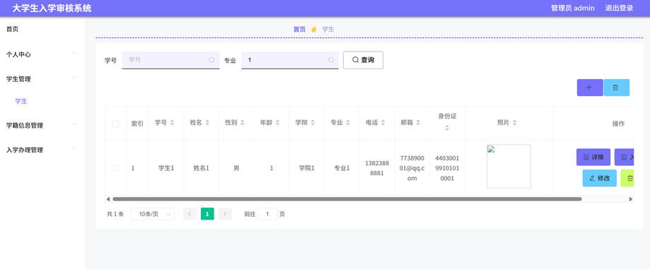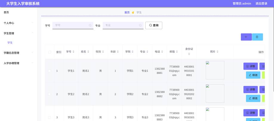 大学生入学审核系统的系统管理员可以对学生信息添加修改删除以及查询操作。具体界面的展示如图5.1所示。