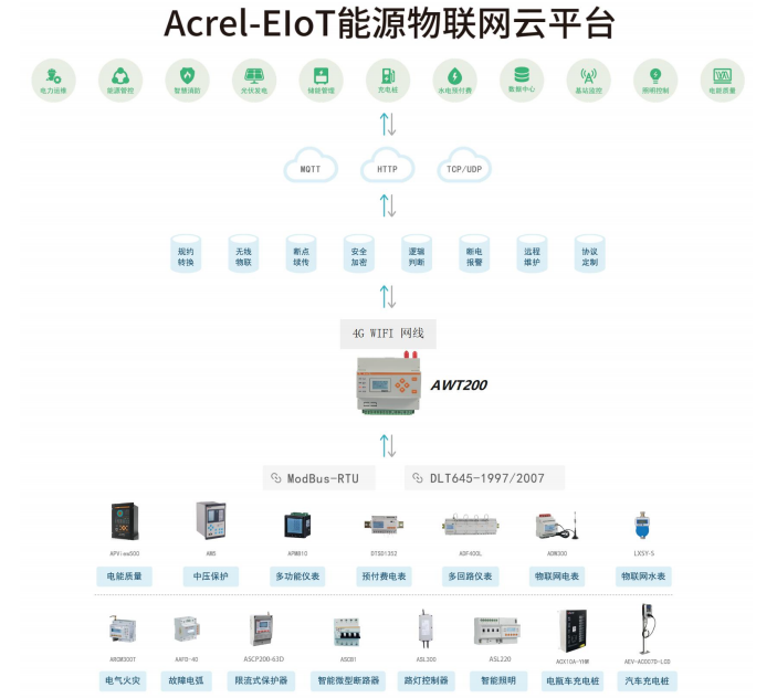 安科瑞的AWT200数据通讯网关能实现设备的监测、控制和数据分析,支持1万个点位的集中采集,并具备断点续传功能。它具有强大的通讯能力,包括8路串口、LoRa、以太网、4G和WIFI,以及多种物联网通讯协议。设备还自带显示屏幕和按键,用于系统配置与维护,适用于远程无线接入网络的场景。