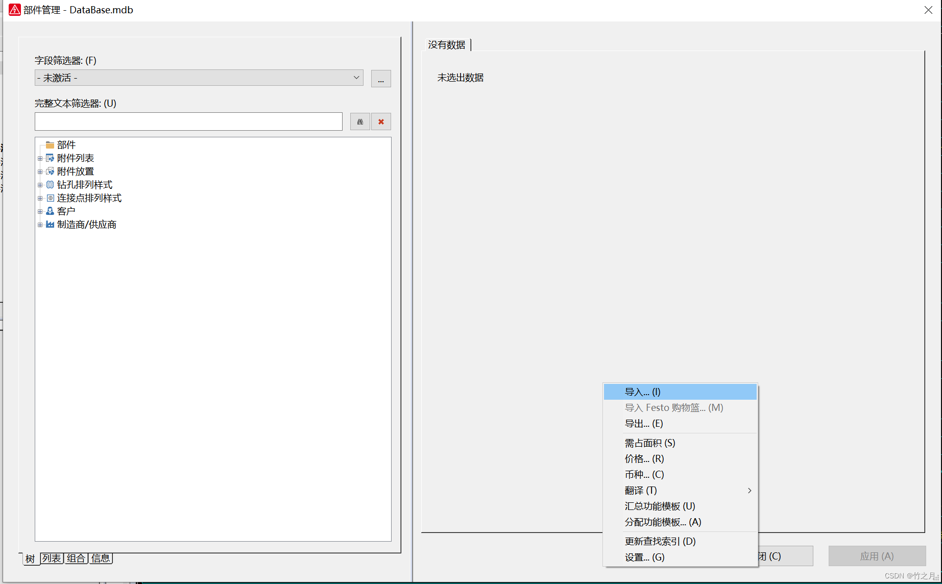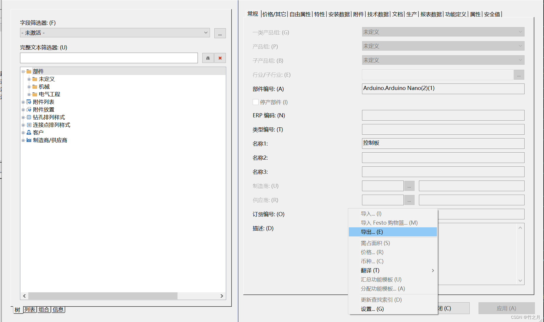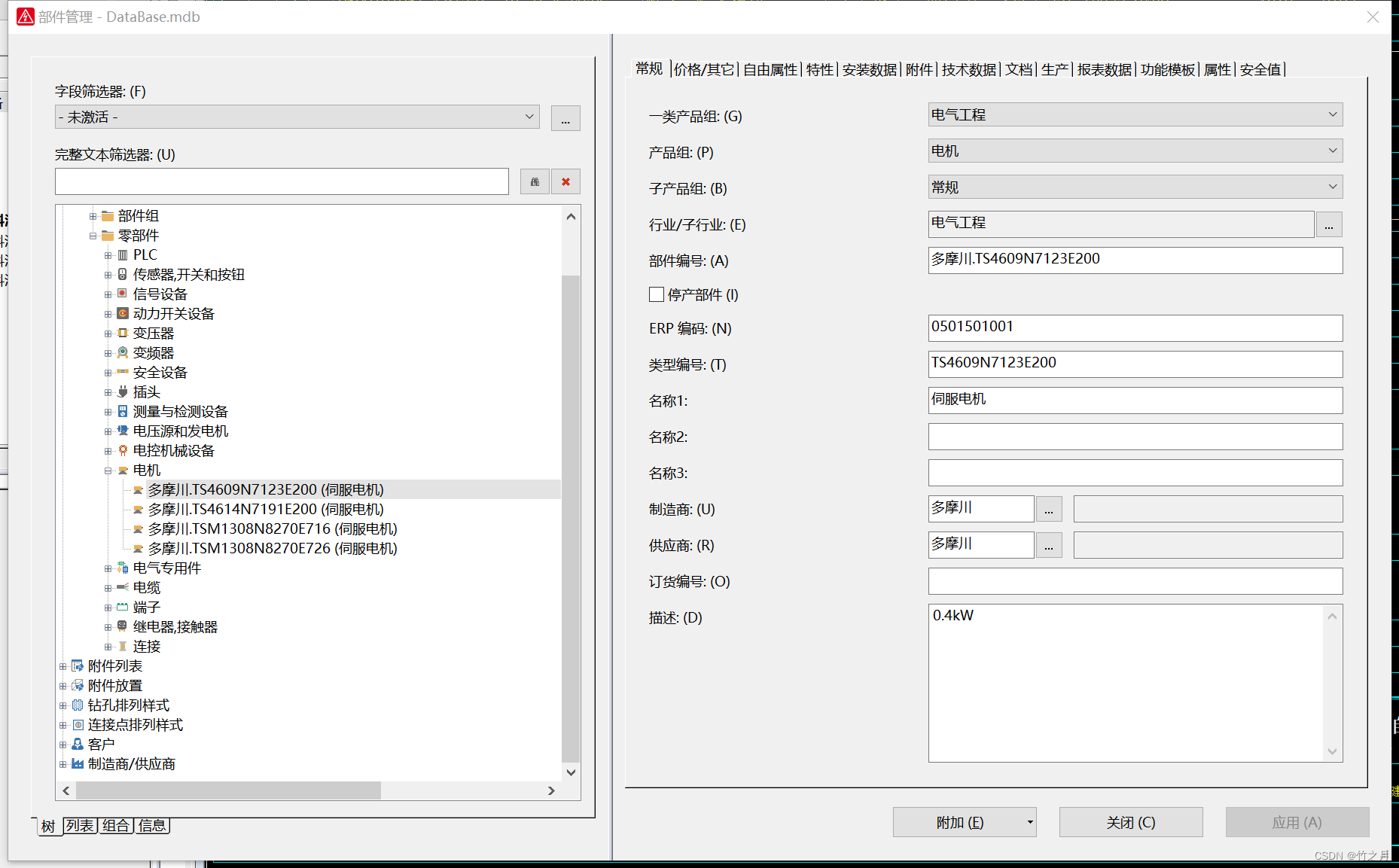 (3)部件数据中,常规、价格/其他、安装数据、技术数据、功能模板中的数据需注意下。