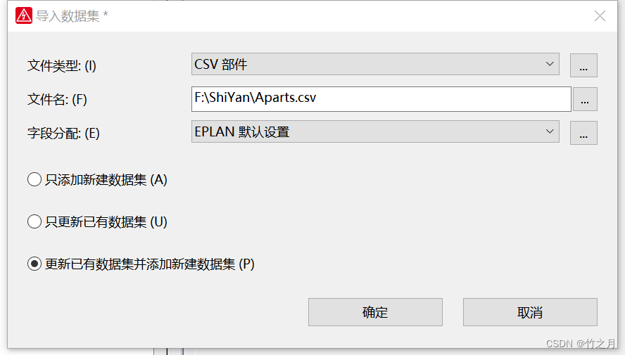 (2)在新建的部件库中导入 之前导出保存的 XLS工作表 ,文件类型选 “CSV部件”,文件名为 之前保存的路径下的文件,选“更新已有数据集并添加新建数据集”,点“确定”,等待数据导入完成,最后的弹窗点击“是”;