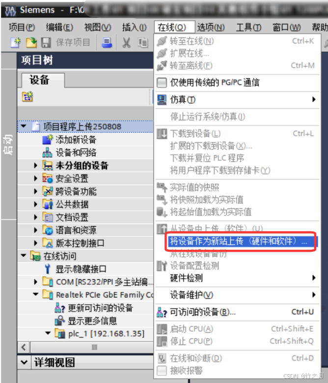 3.点击【在线】——【将设备作为新站上传(硬件和软件)】;