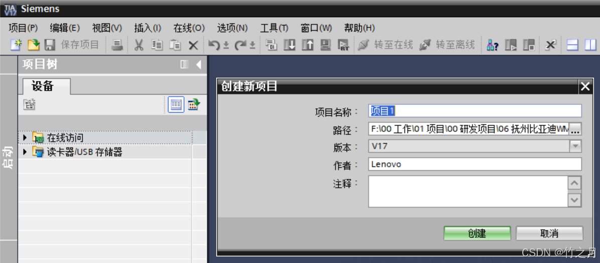 1. 打开博途,新建一个项目,设置“路径”和“名称”即可(不需添加新设备);