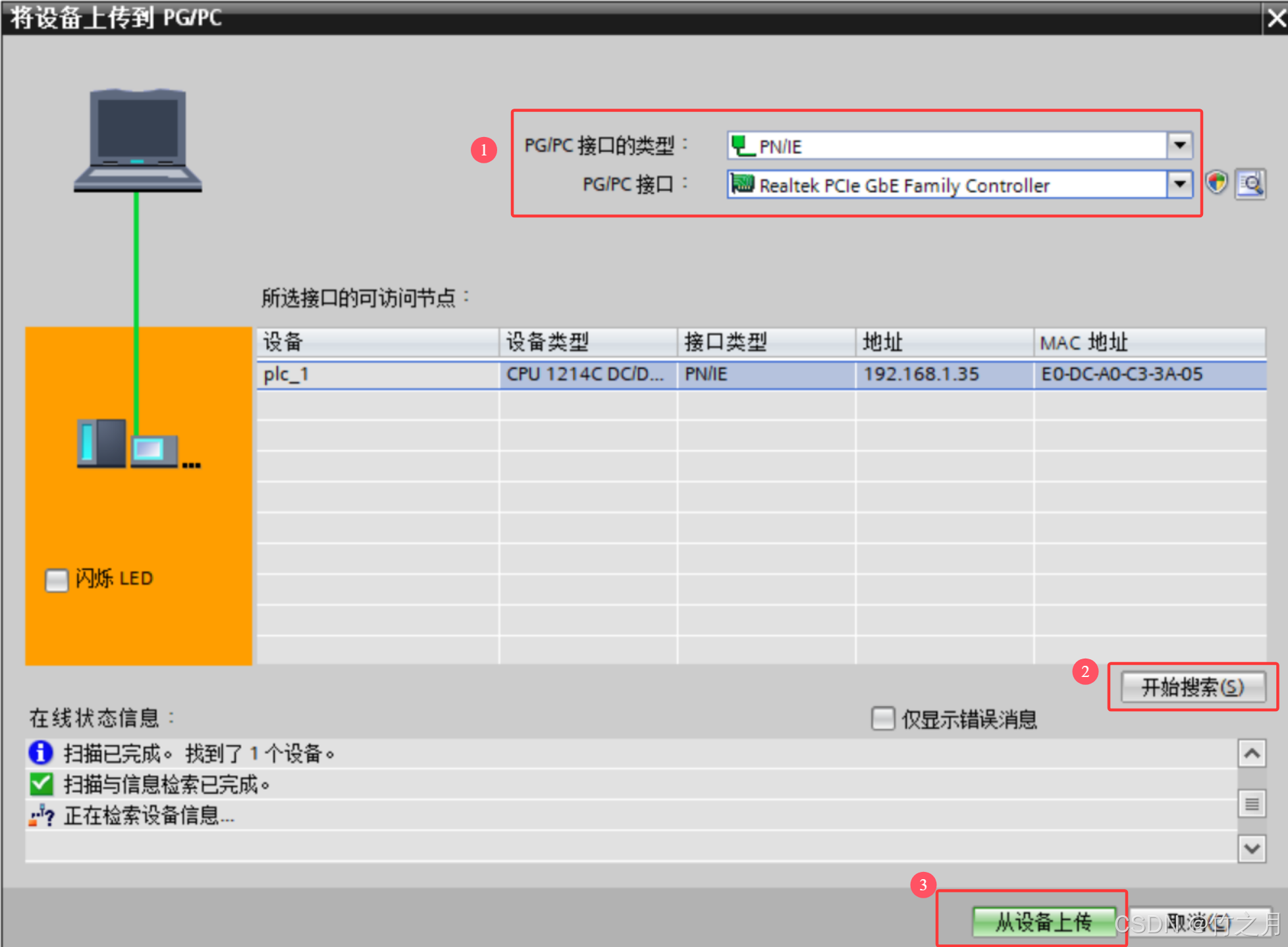 4. 弹出“将设备上传到PG/PC”窗口,依次选择 接口类型后,点击【开始搜索】,选中搜索到的PLC,点击【从设备上传】;