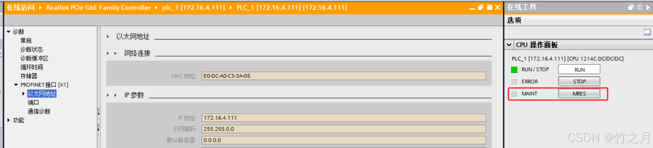 2.修改完地址后,再次通过【在线访问】,可以看到新地址的PLC,MAINT黄色指示灯 不亮,才是正常状态。