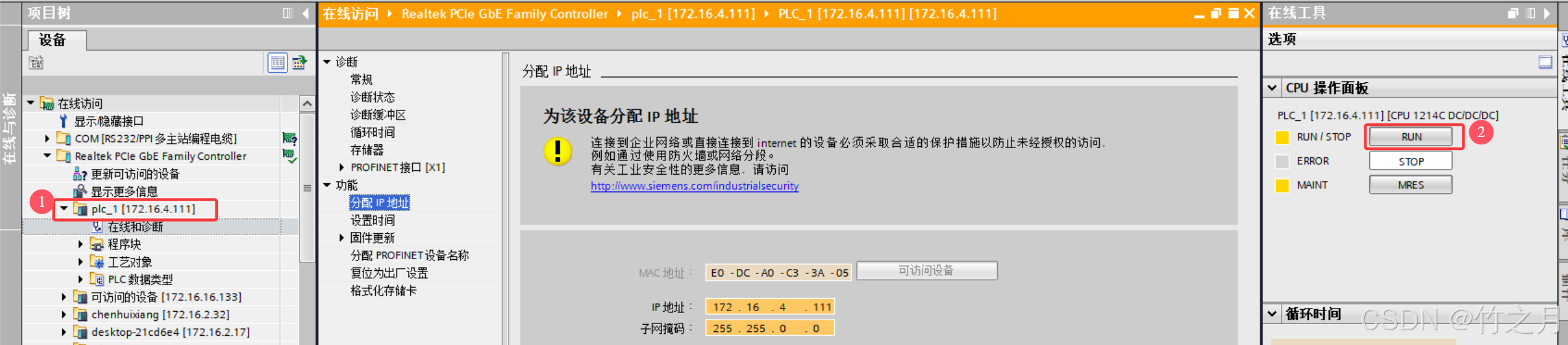 4.修改完地址后,重新通过【在线访问】,找到新地址的PLC,后将模式切换回【RUN】。