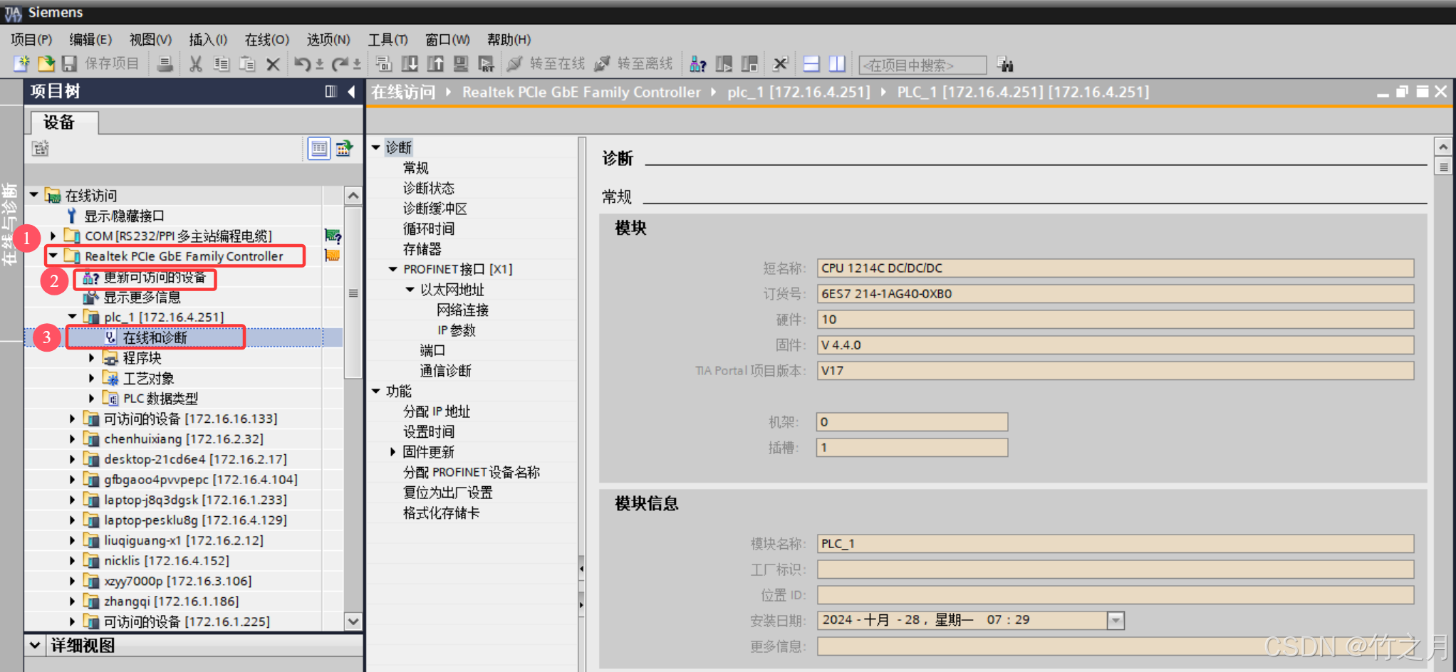 2.选择你电脑的网络接口,后点击【更新可访问的设备】——选中要修改地址的PLC——点击【在线和诊断】;
