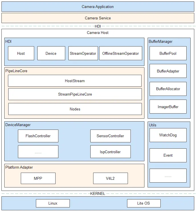 - 框架层:对接 HDI 实现层的控制、流的转发,实现数据通路的搭建、管理相机各个硬件设备等功能。