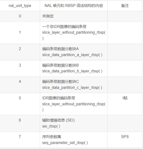 H264 除了需要上报经过编解码的数据外,还需上报关键帧信息。即这一帧是否为关键帧?mp4 编码时需要用到这些信息,那么怎么分析那一帧是关键帧那?主要是分析 NALU 头信息。Nalu type & 0x1f 就代表该帧的类型。Nalu 头是以 0x00000001 或 0x000001 为起始标志的。 该图为 nal_unit_type 为不同数值时的帧类型。我们主要关心 type 为 5 也就是 IDR 帧信息。