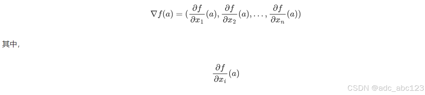 设 f(x1,x2,…,xn)是一个定义在 Rn(n维欧几里得空间) 上的多元函数,函数 f在n维向量点 a=(a1,a2,…,an)处的梯度定义为: