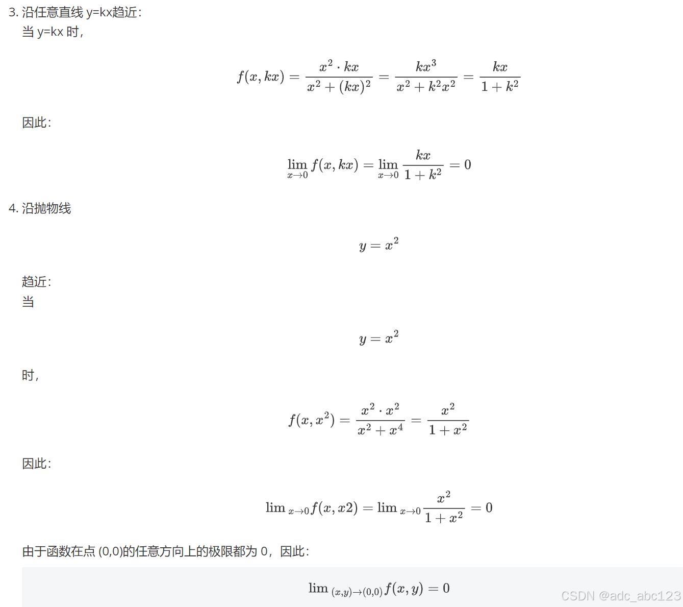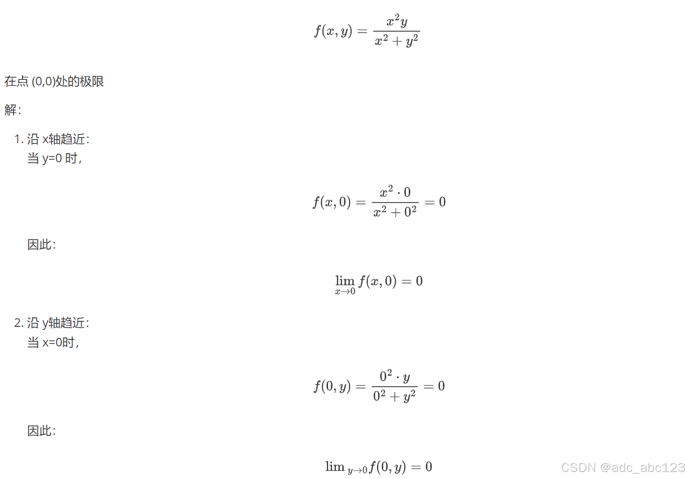 如果 (x,y)从不同方式趋近于点 (a,b),函数 f(x,y) 的值不相等,则表示 f(x,y) 不存在。
