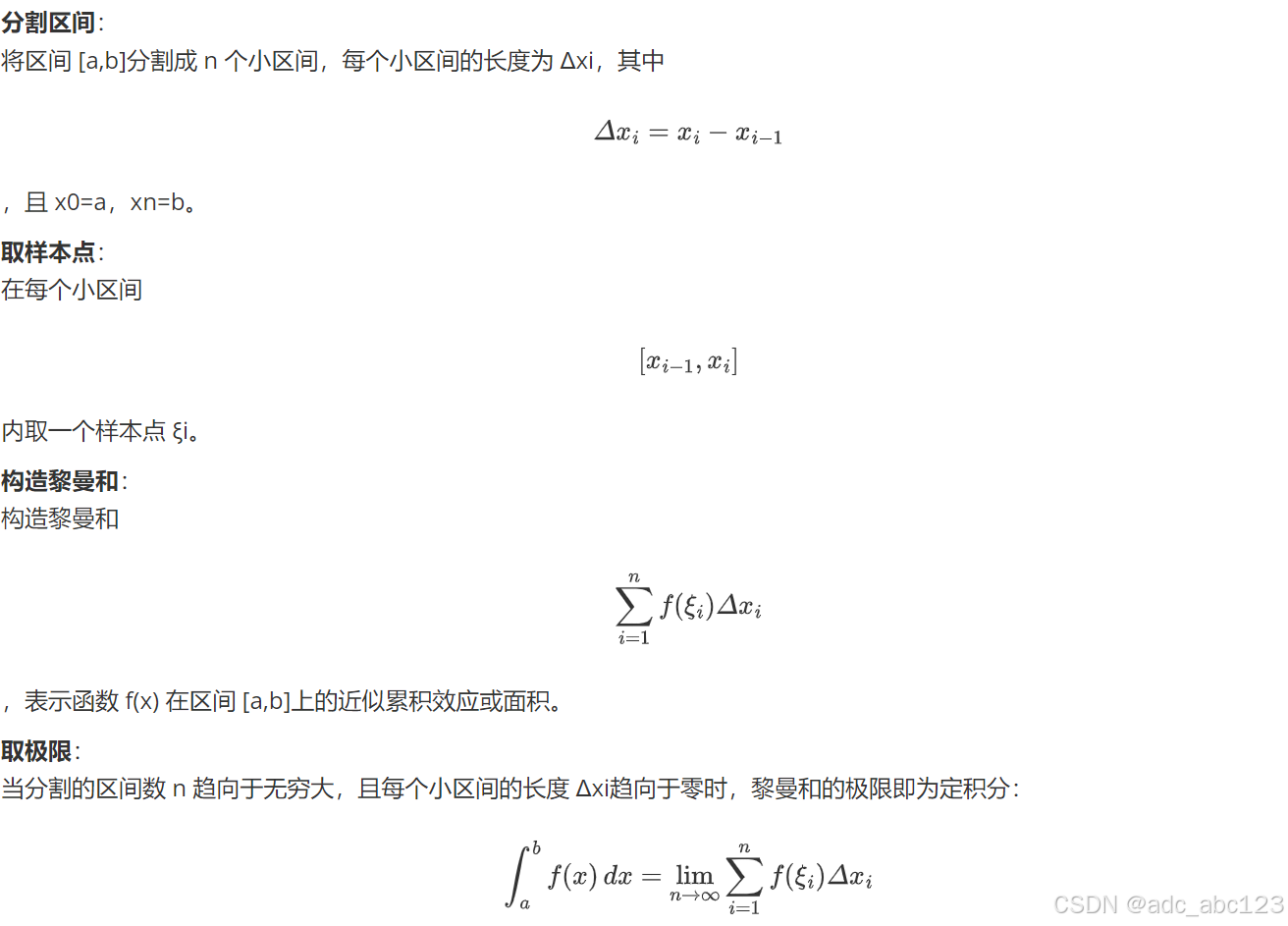 表示函数 f(x)在区间 [a,b]上的累积效应或面积。定积分的定义可以通过以下步骤来理解: