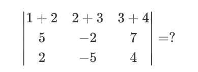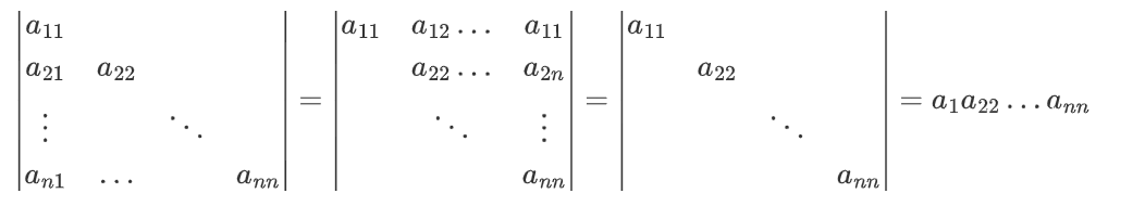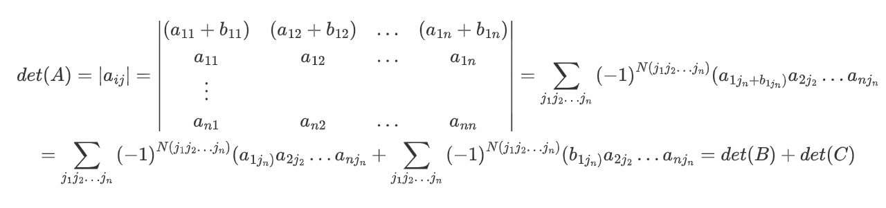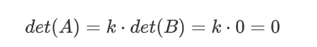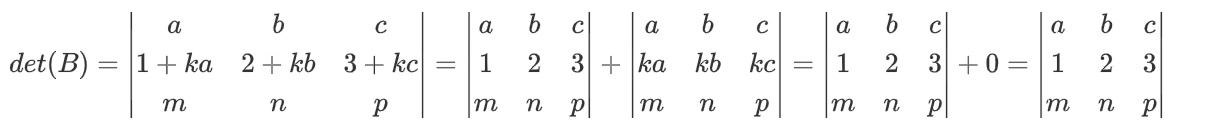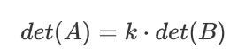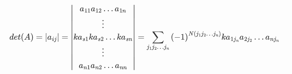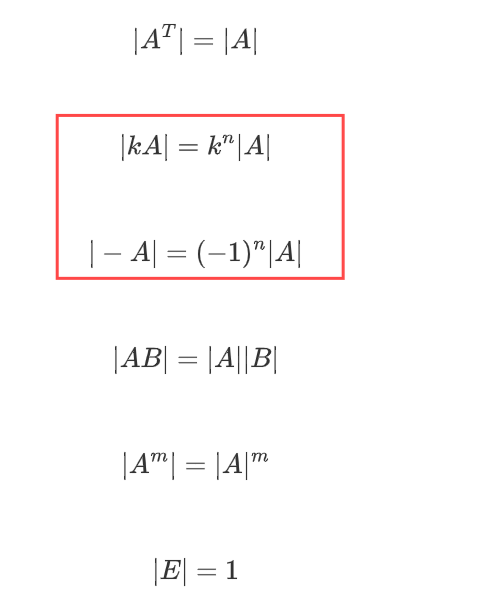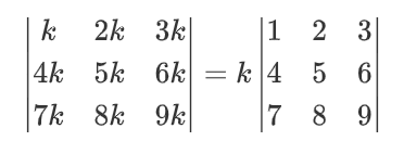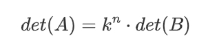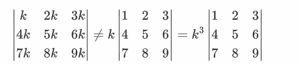 推论:如果一个 n×n的行列式的所有行的所有元素都有公因子 k,那么这个公因子 k 可以提取到行列式外面 n次。