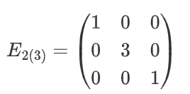 将单位矩阵的第 i 行(列)乘以一个非零常数 k 得到的初等矩阵记作 Ei(k)。例如,将单位矩阵的第 2 行乘以 3 得到的初等矩阵为: