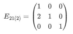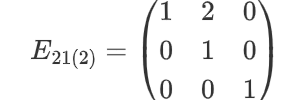 将单位矩阵的第i 行(列)加上第 j 行(列)的 k 倍得到的初等矩阵记作 Eij(k)。例如,将单位矩阵的第 2 行加上第 1 行的 2 倍得到的初等矩阵为: