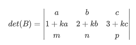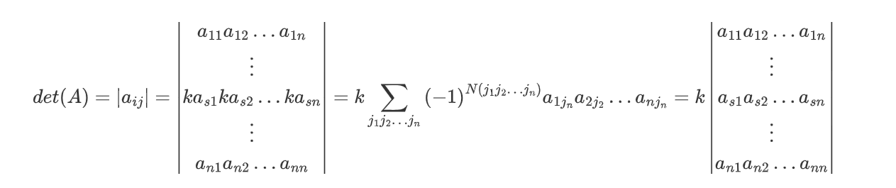 设 A 是一个 n×n 的矩阵,如果 A 的第 i行的所有元素都有公因子 k,那么可以将k 提取到行列式外面,得到的新矩阵记为B,那么有: