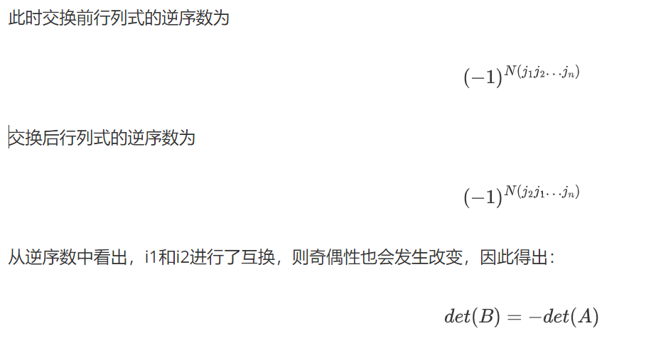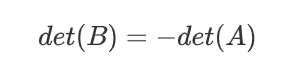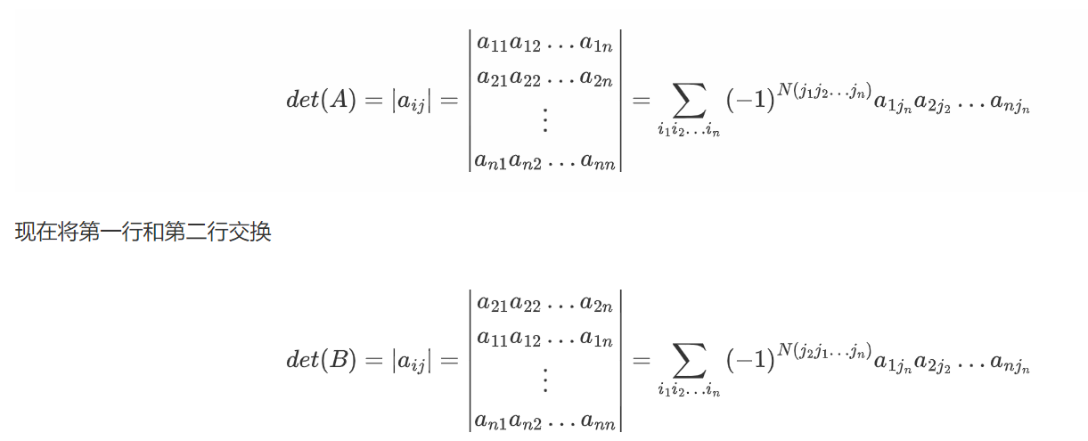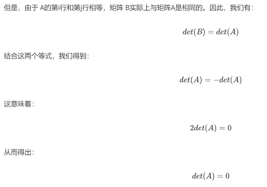 假设 A 的第 i行和第 j行相等,我们可以交换这两行得到一个新的矩阵 B。根据行列式的性质,交换两行会导致行列式的值变为其原来的相反数,即: