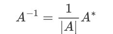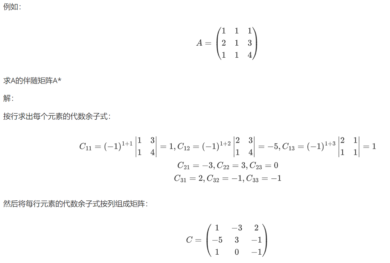设 A 是一个 n×n 的方阵,其元素为 aij。伴随矩阵 adj(A)或A* 是一个 n×n的矩阵,其第 i 行第 j 列的元素是 A 的余子式 Mji 的代数余子式 Cji,即: