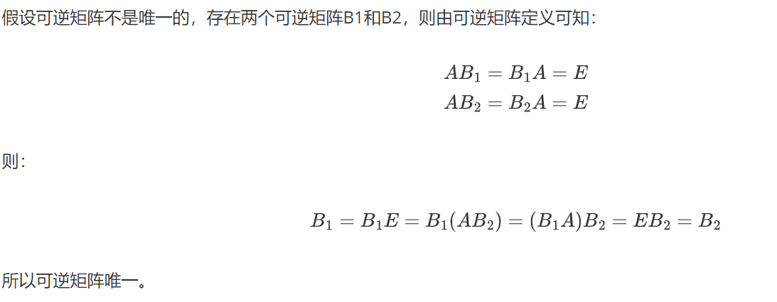 对于一个 n×n 的方阵 A,如果存在另一个 n×n的方阵 B,使得 AB=BA=E,其中 E 是 n×n 的单位矩阵,那么 B 称为 A 的逆矩阵,记作