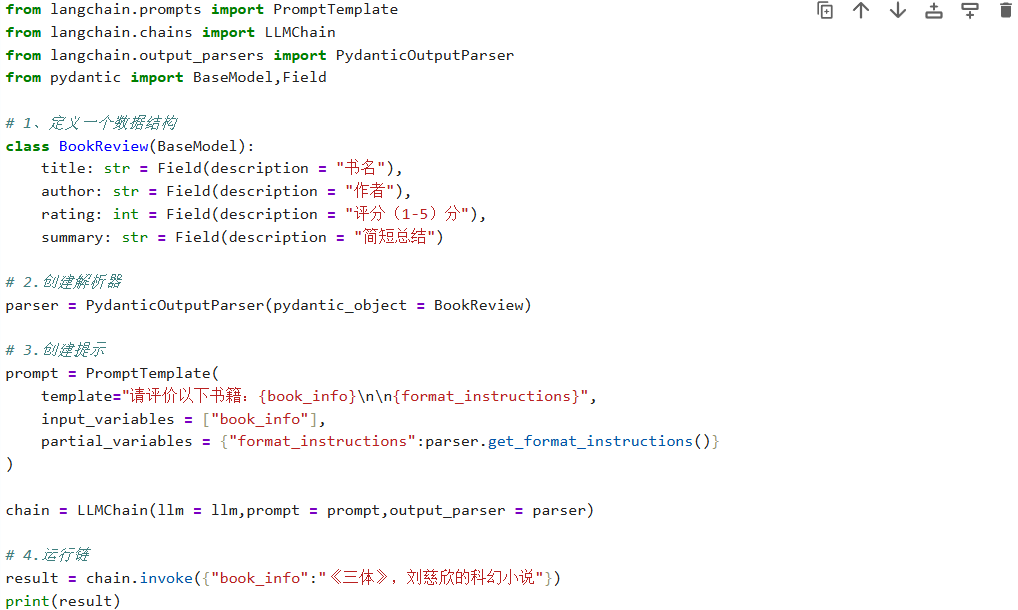 通过 PydanticOutputParser 可以将模型输出解析为预定义的 Pydantic 模型结构: