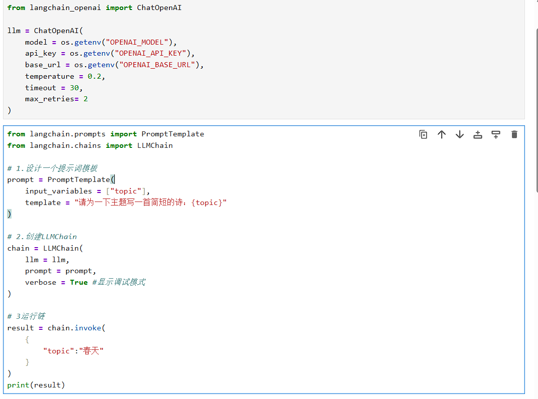 - 声明式输入输出 :通过 input_variables和 output_variables明确指定链需要哪些输入以及会产生哪些输出,便于集成到更大的链式工作流中。