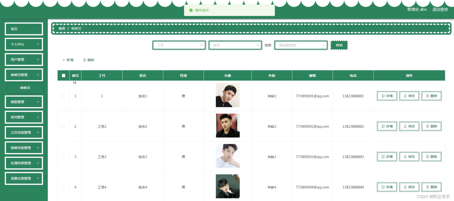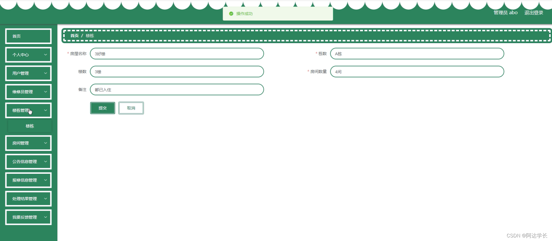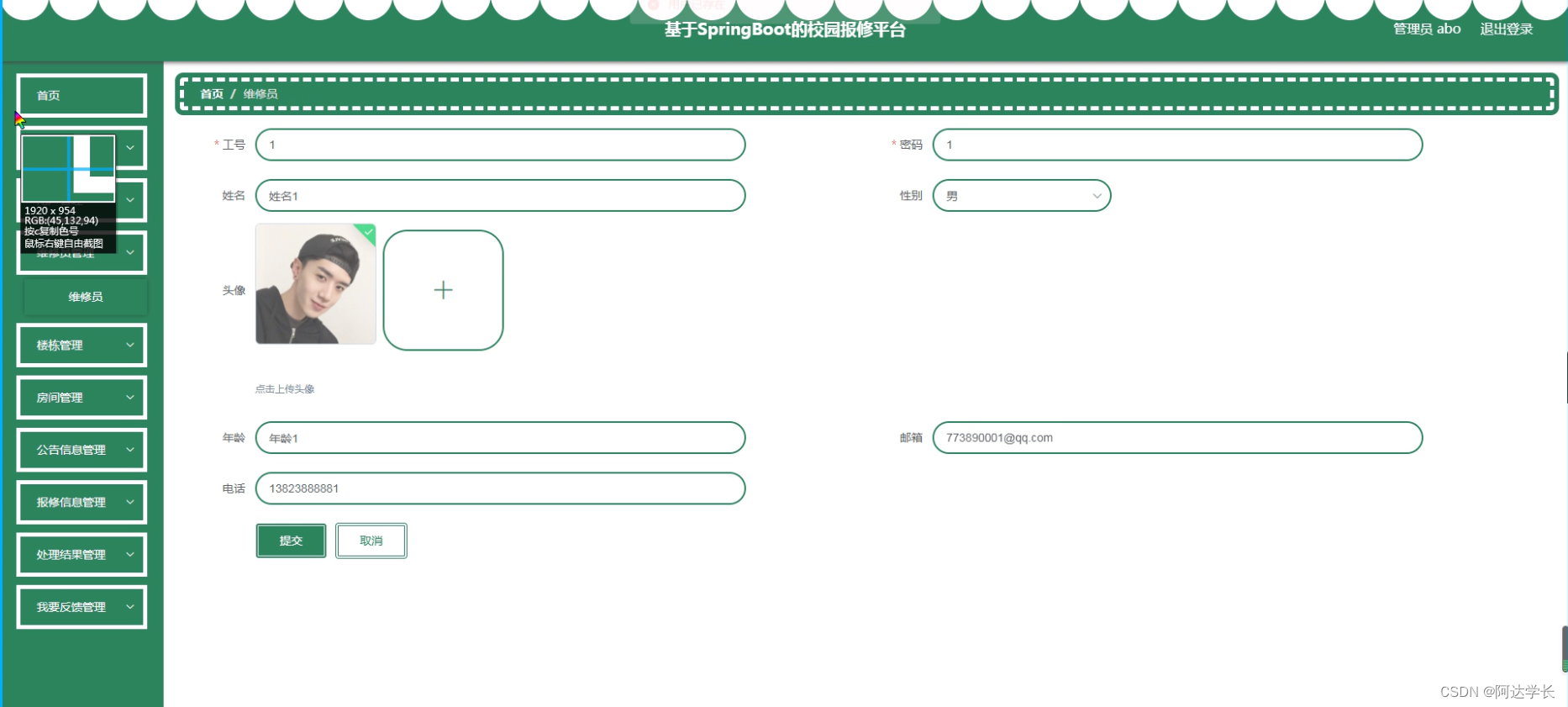 这是一个使用SpringBoot、Mybatis、Maven和Vue技术实现的校园报修系统项目。项目包括前后端分离,数据库为Mysql,支持Eclipse/IDEA环境,管理员账号为abo,密码为abo。运行该项目需要Jdk1.8,Tomcat8.5,Mysql5.7/8.0。前端使用Vue.js,后端使用SpringBoot和Mybatis进行数据操作。