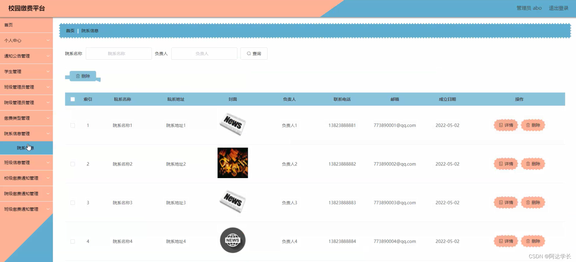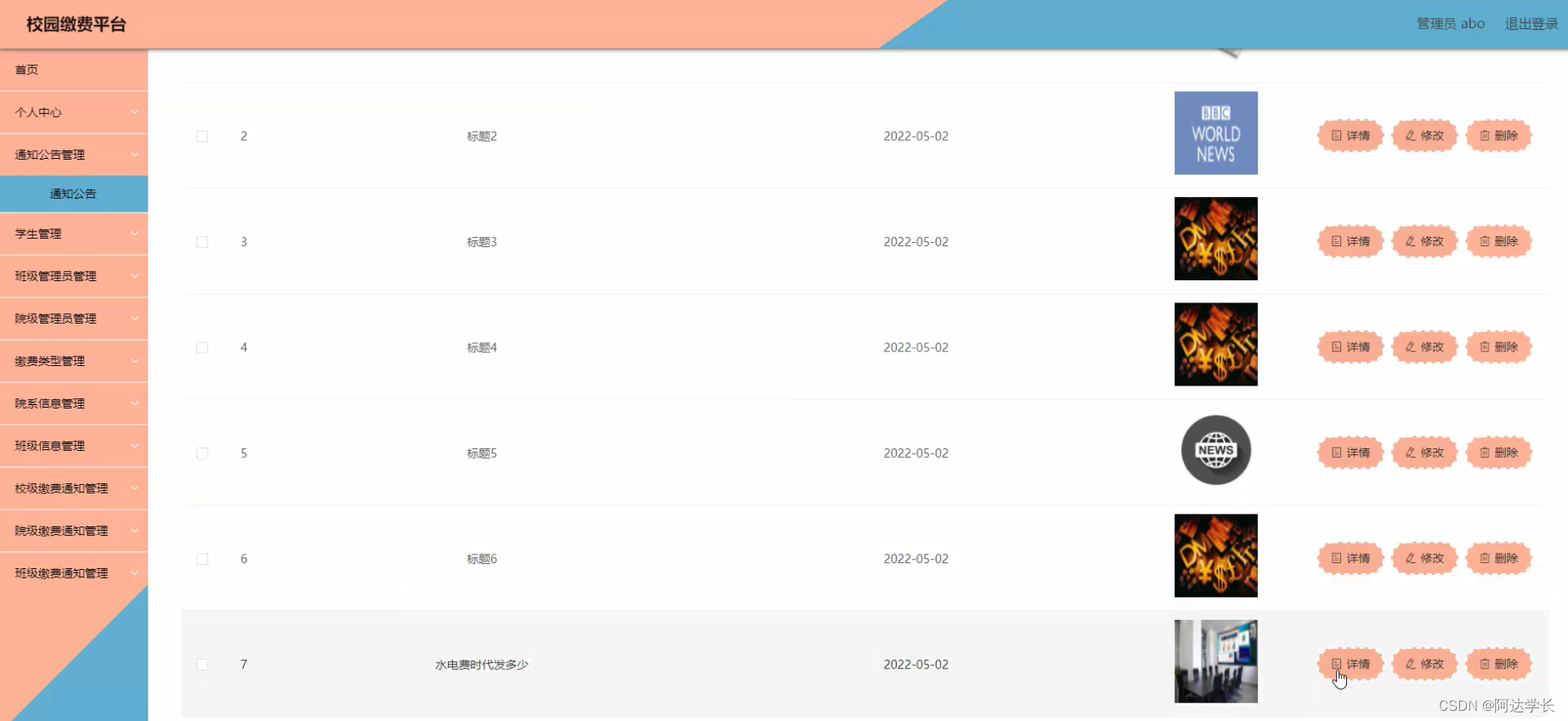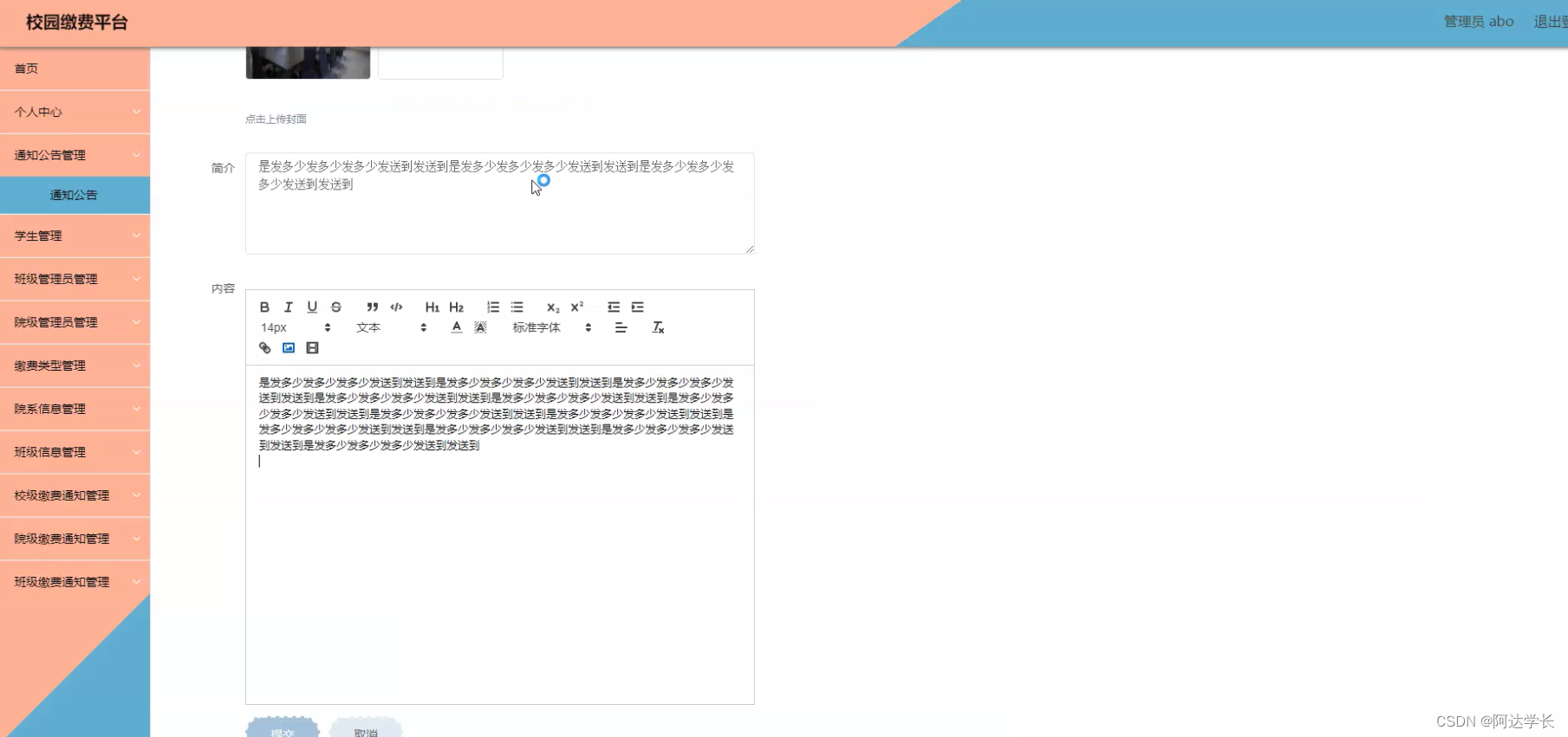 本项目为基于Springboot的校园缴费平台,采用Vue+Mybatis+Maven+Mysql技术栈,支持管理员abo登录。环境配置需Jdk1.8+Tomcat8.5+HBuilderX或类似工具。