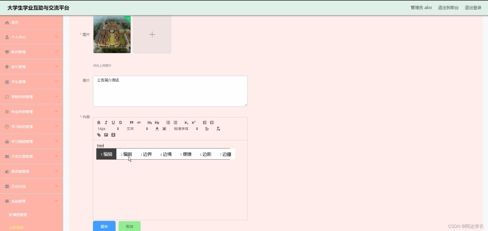 该项目采用Java+Vue+Mybatis等技术构建大学生学业互助与交流平台。环境配置包括Jdk1.8、Tomcat8.5、Mysql等。使用IDEA/Eclipse等工具运行,管理员账号abo,密码abo。