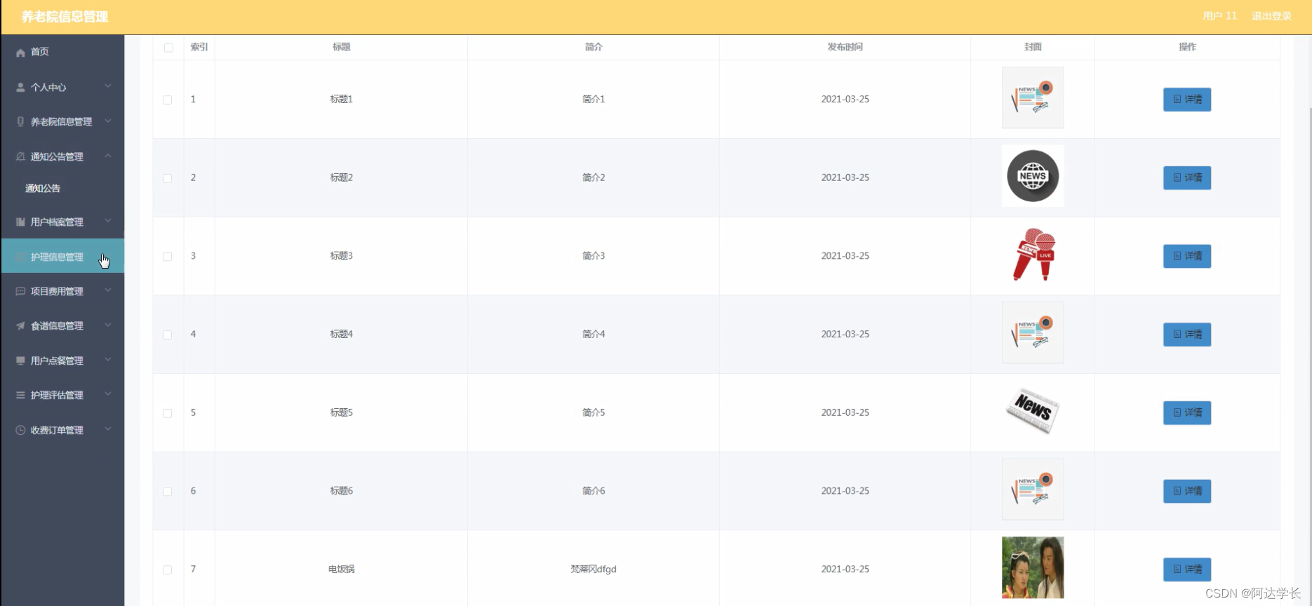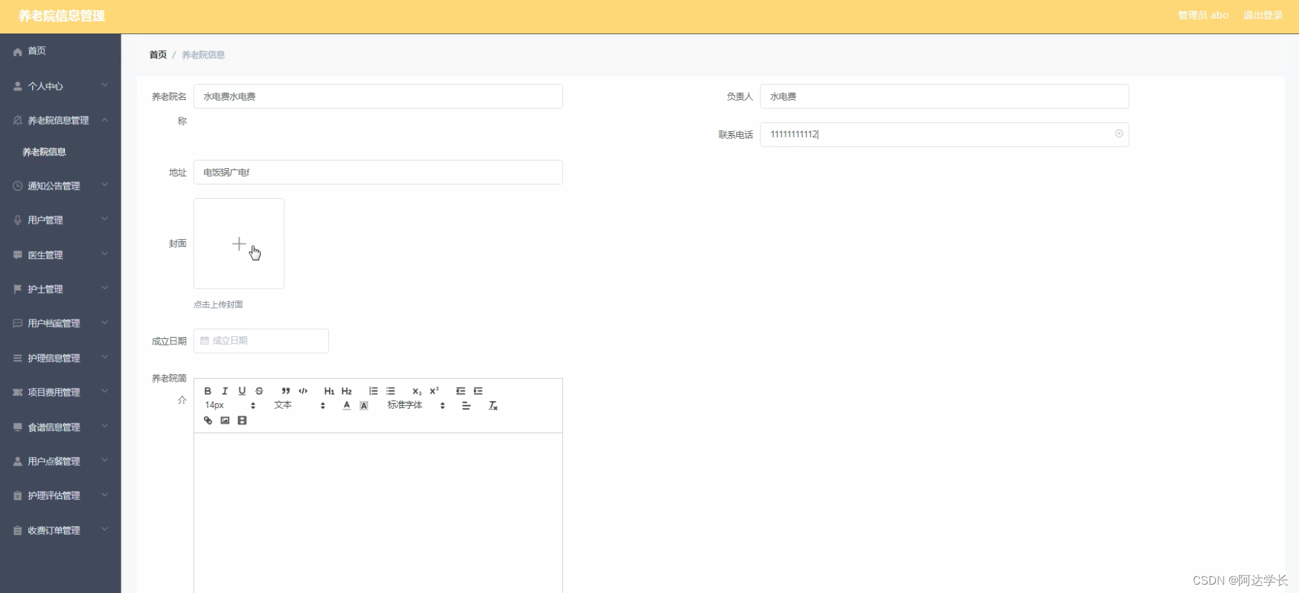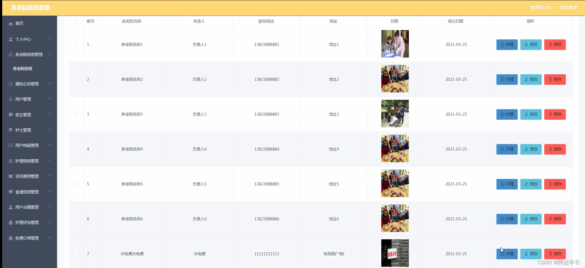 这是一个基于JAVA和Mybatis的养老院信息管理系统项目,包括前后端开发,使用Vue进行前端展示,数据库为MySQL。项目具备用户登录、信息管理等功能,提供源码和数据库文件。管理员默认账号为abo,密码为abo。适合JAVA学习者和毕业设计参考。