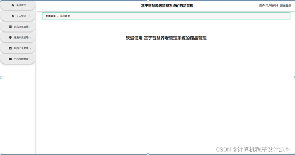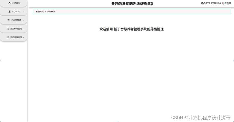 管理员进入主页面,主要功能包括对个人中心,药品管理,用户管理,供应商管理,药品信息管理,健康档案管理,服药记录管理,用药提醒管理等进行操作。管理员主页面如图5-2所示: