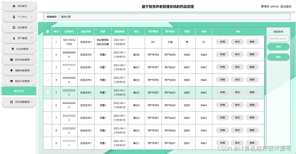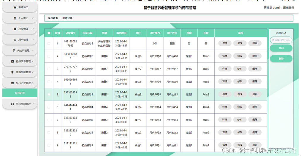 管理员点击服药记录管理。在服药记录页面输入药品名称进行查询或删除服药记录列表;并根据需要对服药记录详细信息进行详情,修改或删除操作。如图5-8所示: